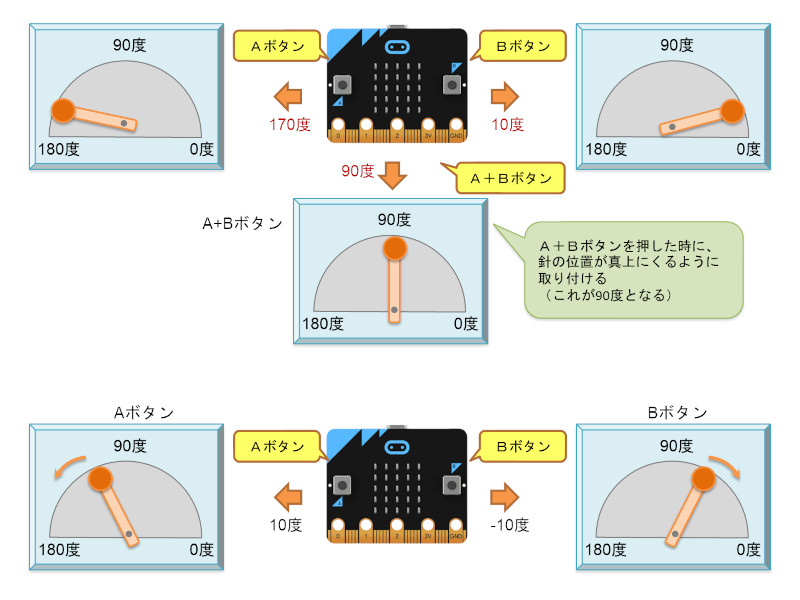 Aボタンを押すたびに :角度を10度ずつ足す Bボタンを押すたびに :角度を10度ずつ引く