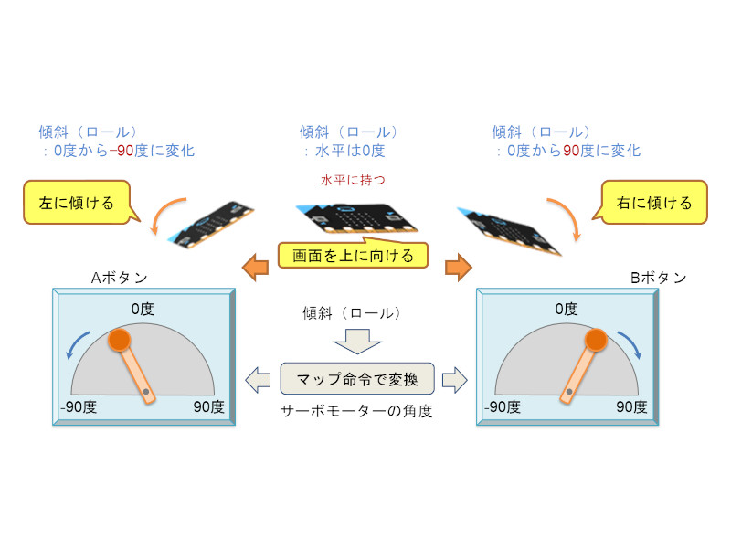 水平に持つ :0度 左に傾けるたびに :左へ傾く 右に傾けるたびに :右へ傾く